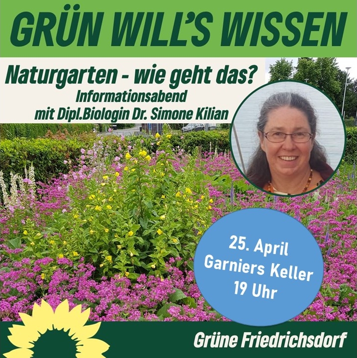 Zum gleichen Thema veranstalten wir für Interessierte am Donnerstag, den 25. April ab 19 Uhr einen Vortragsabend im Garniers Keller: Die Biologin und Naturgartenplanerin Dr. Simone Kilian wird zum Thema "Naturnaher Garten" Tipps geben und Fragen beantworten, wie eine artenschützende Gartengestaltung in Zeiten des Klimawandels gelingen kann. Sie ist Naturgartenprofi der Akademie des Naturgartenvereins e.V. (http://www.naturgarten.org/), nähere Informationen zu unserer Referentin findet Ihr auf ihrer Website https://harmoniegarten.com/ .