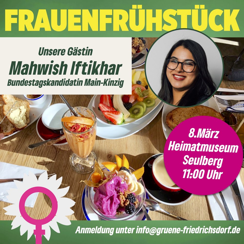 Am 8. März 2025, dem Internationalen Frauentag, laden wir vom GRÜNEN Ortsverband in Friedrichsdorf zum Frauenfrühstück nach Seulberg ein. Ab 11 Uhr sind Friedrichsdorfer Frauen zum Frühstück in die Klause des Heimatmuseums Seulberg eingeladen. Als besonderer Gast wird die Bundestagskandidatin aus dem Wahlkreis 179 (Main-Kinzig-Kreis), Mahwish Iftikhar (https://mahwishiftikhar.de/), erwartet. Die junge Frau wird über ihren Lebensweg, ihren Weg in die Politik und ihre politischen Ideen sprechen.