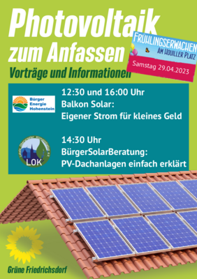 Der Ortsverband von Bündnis 90/die Grünen lädt interessierte Bürgerinnen und Bürger an seinen Stand auf dem diesjährigen Frühlingserwachen am 29.4.2023 ein. Nachdem es im vergangenen Jahr um den CO2-Fussabdruck ging, steht in diesem Jahr das Thema "Photovoltaik zum Anfassen" im Fokus. Dazu haben Grünen Experten aus der Branche eingeladen.