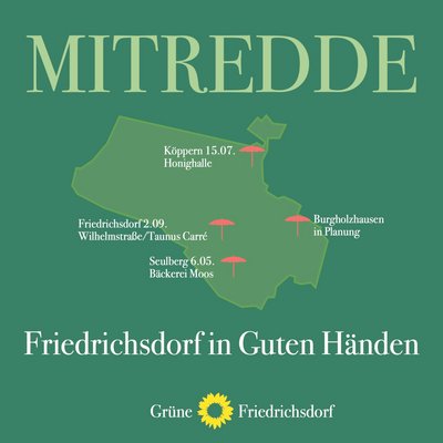 In den nächsten Monaten stellen sich die GRÜNEN Friedrichsdorfer Stadtverordneten und Ortsbeiratsmitglieder dem Dialog mit den Bürgerinnen und Bürgern des jeweiligen Stadtteils. Damit möchten unsere Mandatsträgerinnen und –träger den Bürgerinnen und Bürgern des jeweiligen Stadtteils die Möglichkeit geben, ganz unkompliziert ins Gespräch zu kommen.